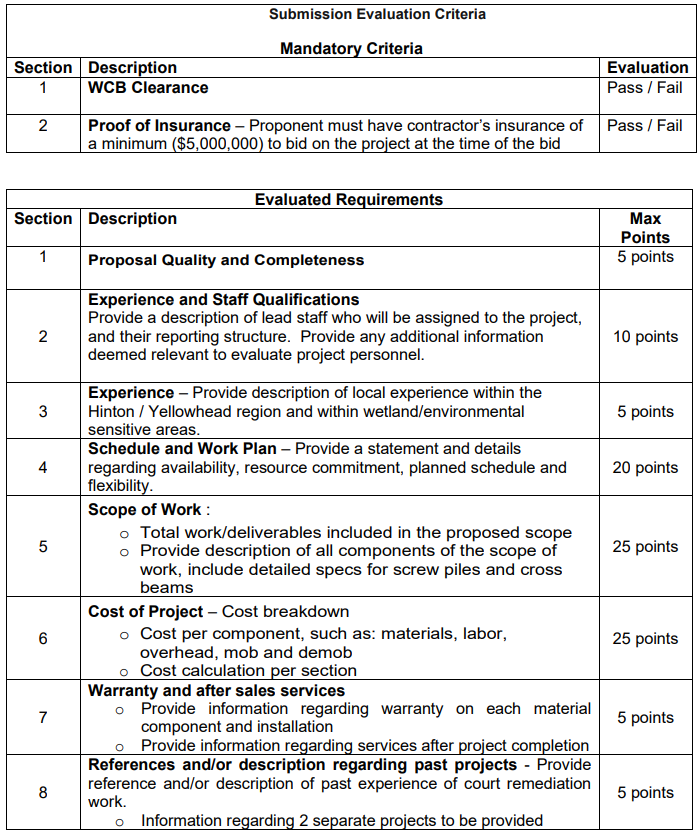 The Town of Hinton is pleased to announce that both RFP Bid # BBW 01-2021 and RFP Bid # BBW 02-2021 have been awarded to Fine Line Services Ltd. Ordering of materials for the project shall commence immediately to secure current pricing, specifically with respect to current rising lumber costs.