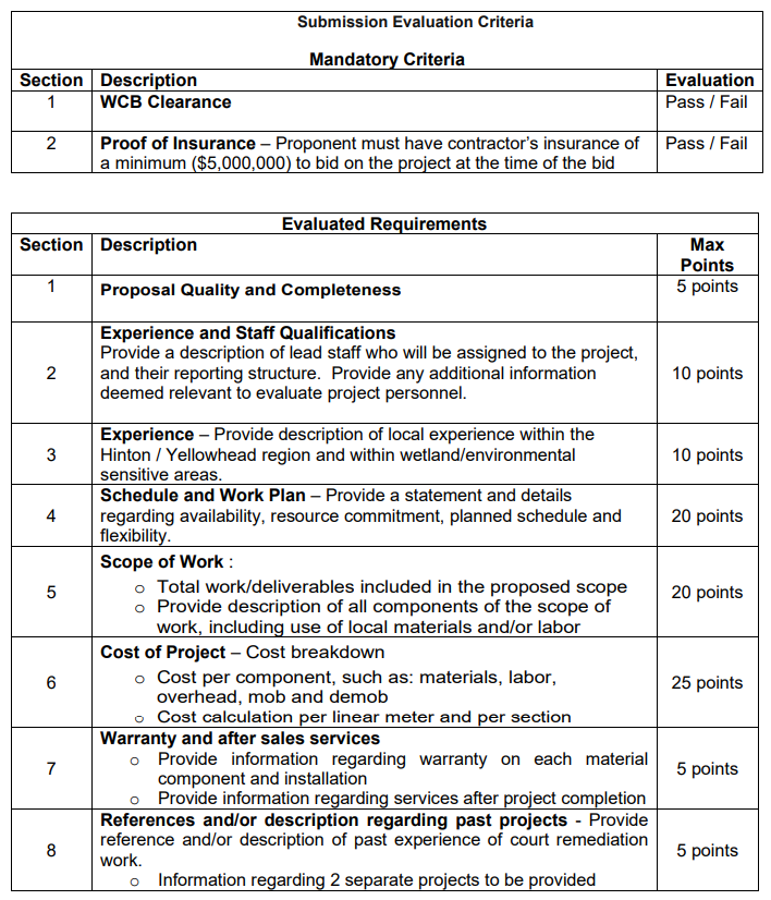 RFP Bid # BBW 01-2021 sought bids for the piles and structure of the boardwalk, while RFP Bid # BBW 02-2021 sought bids for the removal and replacement of the wood decking. Proponents were able to bid on one or both of the RFPs.