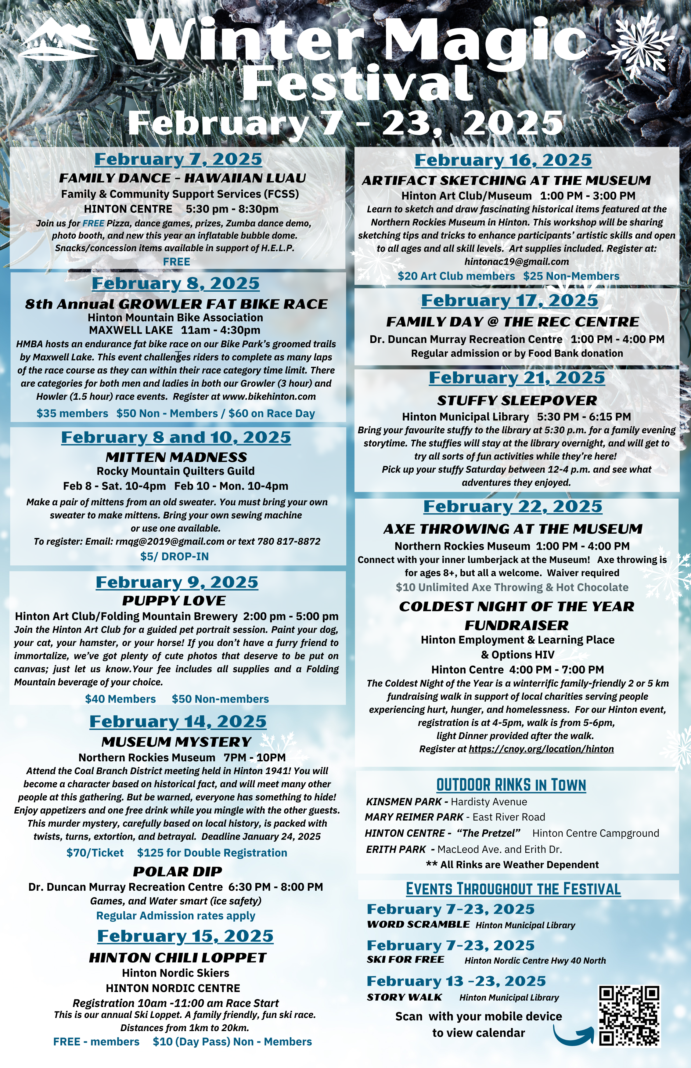 In 1987, the province was swept with Olympic fever. Calgary was to host the Winter Olympics, and the Alberta Sport Council (ASC) was encouraging all Albertans to find new ways to engage with Olympic sports. The ASC brought outreach opportunities for all communities to try out not just the big-ticket sports but also some of the more unique or European elements. Hinton has always hosted events in the winter months, being situated in the natural splendour of the Rockies, but with this support from the province and the momentum of the Olympics, a plan to bring together as many unique activities and events under one banner and create a festival was begun.