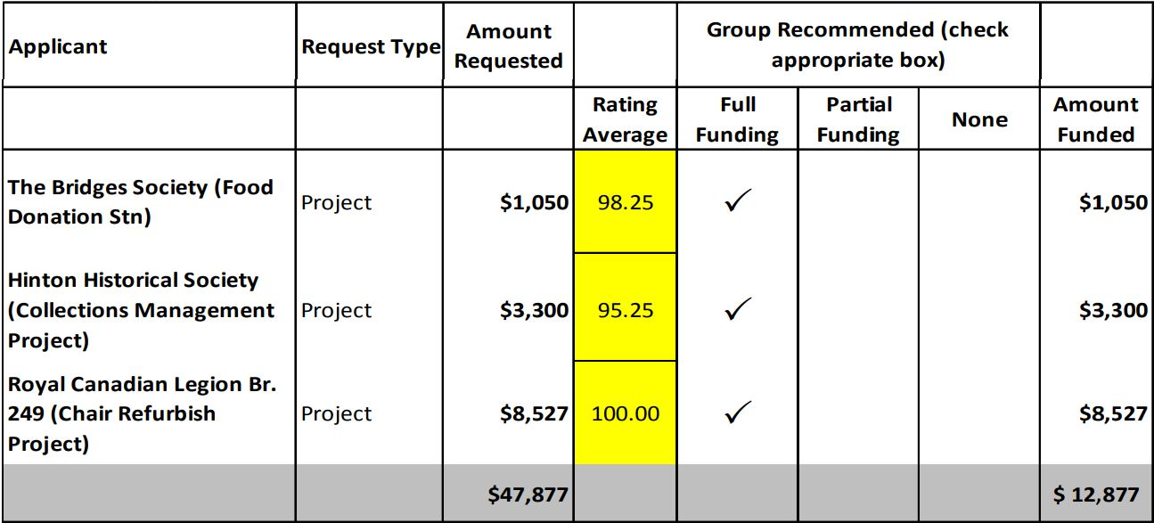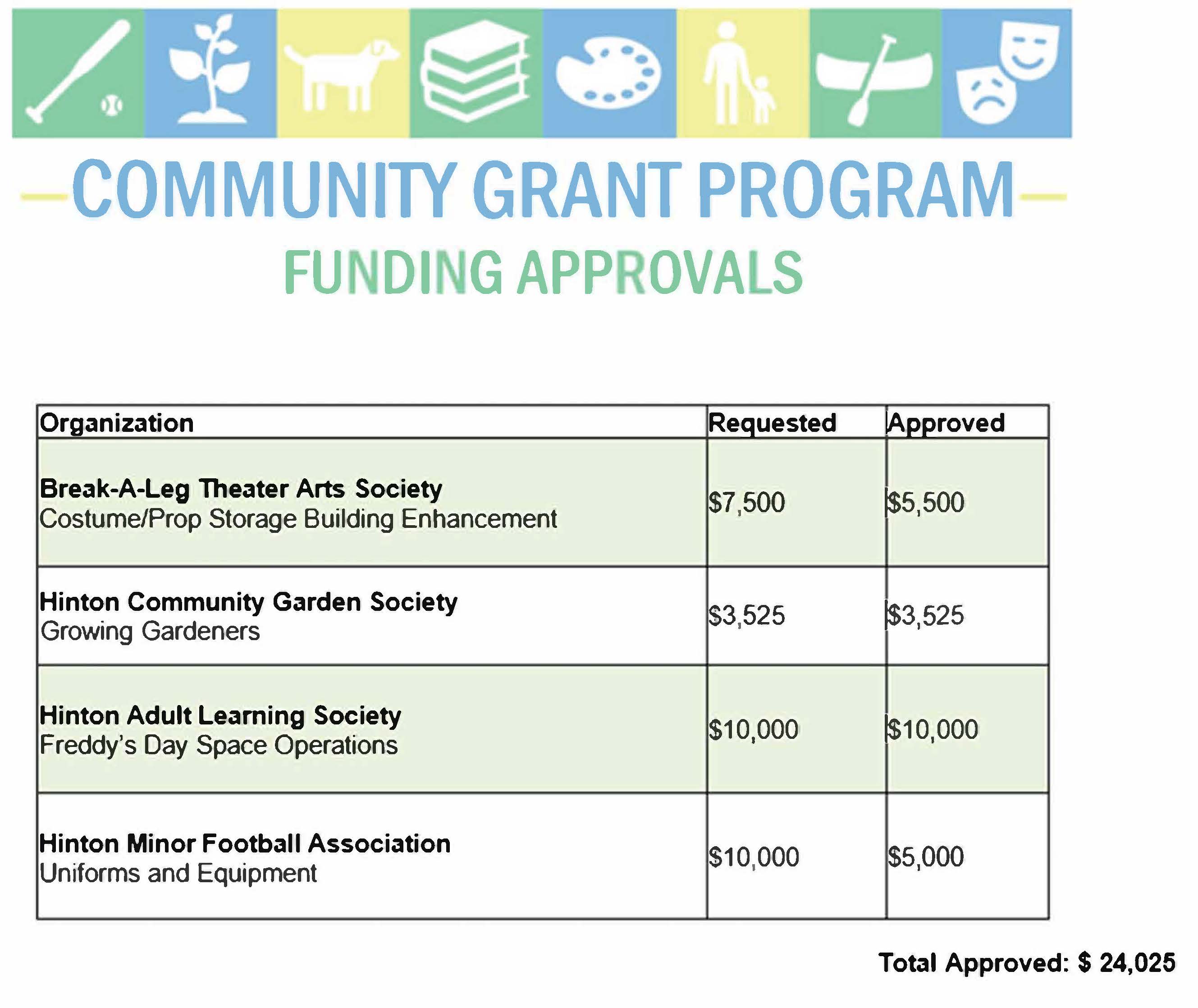 - All completed funding requests are presented to the Hinton Grant Funding Advisory Committee to review, rank, and make recommendations to Council. You have the option to participate in a 10-minute question and answer session with the Committee.